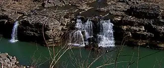- Twin Falls, a cascade waterfall that spills down from a cavern into the Caney Fork, just beyond the powerhouse. The waterfall was created by the Great Falls Dam, which caused the Collins River to rise. The rising waters began seeping into caverns on Rock Island's south shore and exiting at the falls on the north shore.