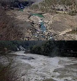 In 1904, the Great Falls Power Company purchased the Great Falls property with plans to dam the Caney Fork and provide power to the Nashville area. The company built several coffer dams, all of which were destroyed when the river flooded in 1914. The company, which often struggled with finances, finally began construction on the Great Falls Hydroelectric Plant in 1915, and the dam went into operation in 1917. The Tennessee Electric Power Company (TEPCo) purchased the Great Falls Power Company in 1922, and tripled the dam's operating capacity. The Good Friday Flood of 1929, in which the Caney Fork reached record volumes, destroyed the dam's substation and flooded its powerhouse, but the dam held.[6] In 1939, the TEPCO Dam was purchased by the Tennessee Valley Authority, which continues to operate it.