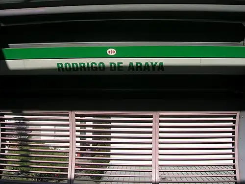 Rodrigo de Araya is an elevated metro station on the Line 5 of the Santiago Metro, in Santiago, Chile. The station consists of an elliptical cylindrical structure enclosing the side platforms and tracks. Staircases jut out from the tubular structure and lead to the concourse level, which is located below the viaduct deck. The station was opened on 5 April 1997 as part of the inaugural section of the line, from Baquedano to Bellavista de La Florida.[1]
