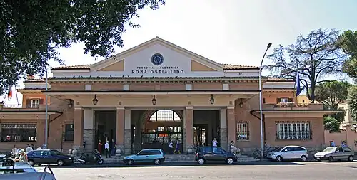 The station was designed by Marcello Piacentini.[1] A quite similar one was the Ostia Nuova terminal train station, whose foundation stone was laid on December 10, 1920, also in the presence of the King, and that was destroyed during the war.