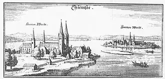 Herrenchiemsee (left); Engraving by Merian, c. 1644