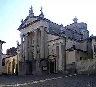 In 1516 Bishop Bonafacio Ferrero replaced the Romanesque façade with a Bramante-style portico. Bishop Ottavio Pocchettini (1824–1837) later commissioned architect Giuseppe Martinez to remodel the building in Late Baroque style. The Bramante-style portico was reworked into a Palladian style in 1854.[31]