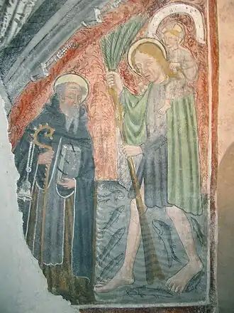 The carved walnut reredos depicting motifs of plants and human and animal figures, attributed to Baldino of Surso, are now in the Civic Museum of Ancient Art in Turin. The crypt contains frescoes from the thirteenth to the fifteenth century, some damaged by time. On the foundation pillar of the southern bell tower, a holy warrior is depicted, possibly representing a member of the Theban Legion. There is also some early work by Giacomino of Ivrea and a painting attributed to the Maestro di Oropa.