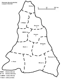 In 1798, the Minsk diocese comprised 10 deaneries: Minsk, Borisov, Igumen, Bobruisk, Sluck, Pinsk, Mozyr, Rechitsa, Dzisna, and Vilna.[101] By 1800, the diocese had expanded to 11 deaneries[94] with the addition of the Minsk deanery in the county.[102]
