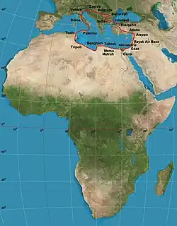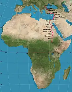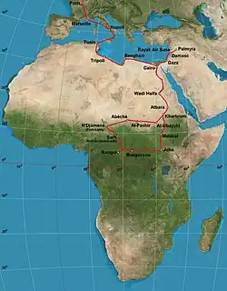 The route was: Paris – Marsilia – Naples – Tunis – Tripoli – Bengazi – Cairo – Wadi Halfa – Khartum – Al-Fashir – Abéché – Fort-Lamy – Fort-Archambault – Bangui – Bangassou – Juba – Malakal – Atbara – Cairo – Gaza – Rayak Air Base – Damascus – Palmyra – Gaza – Cairo.[50][51][52]