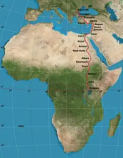 The crew left Cairo on 29 October along the length of the Nile. At Assiut they met Muhammed Taher Pasha, Chairman of the Aero Club of Egypt.[25] They flew over Abydos, the Valley of the Kings, Thebes, Luxor and Karnak and stopped at Assuan. The following day they flew over the first cataract of the Nile, the Philae Island, and hedgehopped over the temples of Ramesses II and Nefertari at Abu Simbel. They entered Sudan and stopped at the customs point of Wadi Halfa. They flew over the second cataract, then cut the meander of the Nile through the desert, along the Wadi Halfa – Abu Hamad railway line up to Railway Station No. 6, where they overnighted. The following day they flew over the fifth cataract, Atbara, and after the sixth cataract they reached Khartum, where they stayed for two days as the engine of Pantazi's aircraft needed overhauling.[26][27]