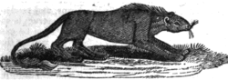 The Rompo is a mythological beast said to have been found in India and Africa. It is described as having the head and mouth of a hare, the ears of a human, a mane, a slender body approximately three feet in length, a long tail ending in a hairy brush, the front feet of a badger, and the rear feet of a bear. It feeds on human corpses, which it obtains by digging up graves, and is termed the "Man-Eater" due to this habit. After discovering a body, instead of immediately devouring it, it circles around it several times as if afraid to seize it.[1] The legend of the Rompo may have been inspired by the ecology and behavior of hyenas.[2]