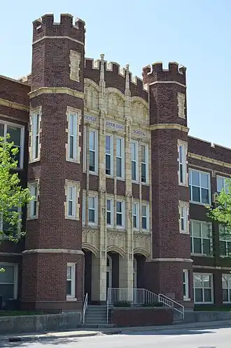 Roosevelt Junior High School is a historic school located in Decatur, Illinois, United States. Built from 1917 to 1921, the school was the second exclusive middle school in the city after the now-closed Centennial Junior High School. Decatur architectural firm Brooks, Bramhall & Dague designed the school in the Collegiate Gothic style, a popular choice for educational buildings at the time. The three-story building is built from red brick and features terracotta trim designed to resemble stone. The front entrance is designed to resemble a castle's keep, with octagonal turrets on either side and the extensive use of terracotta to form arches, piers and spandrels. The rest of the building features buttresses and Gothic arches throughout, and a battlement surrounds the edge of the roof. The school operated continuously from its opening until 2000.[2] In recent years, the building has been converted to an apartment complex.[3]