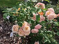 Double, flat or slightly cupped flowers with a strong, fruity fragrance, and an average diameter of 10 cm (4 inches)[1] appear in small cluster of 3 to 5 in flushes throughout the season.Their colour is an apricot blend, with stronger colours at the petal base, fading to cream at the edges. The flowers have about 70 petals arranged in a quartered bloom form, with the outer ones lighter than the inner ones, and are well suited as cut flowers.[2]
