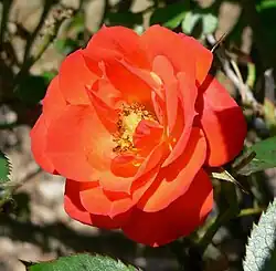'Cricket' is a small, bushy miniature rose, 12 to 18 in (300–460 mm) in height, with a 15 to 18 in (380–460 mm) spread. It has a double (16–25 petals) bloom form. Bloom size is less than 2 in (51 mm). The rose has a mild fragrance. Flower color is orange and an orange-red blend. It blooms repeatedly throughout the growing season. The rose cultivar was developed by Christiansen and introduced in the United States by Armstrong Roses in 1978. The plant's stock parents are Miniature rose, 'Anytime', and Floribunda, 'Katherine Loker'. It makes a good container rose.[1][2]