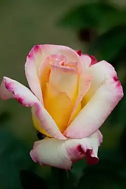 The high-centered, double-shaped flowers have 25–28 petals and a creamy-white colour with more or less pink-edged outer petals. The Ultimate Rose Book says that 'Garden Party' has "the 'Peace' colors but more delicate". The flowers develop from urn-shaped buds, reach an average diameter of 11 cm (4.5") and have a light lemony fragrance.[1] 'Garden Party' blooms repeatedly throughout the season.[2] Thanks to its large well-shaped flowers, it is a popular exhibition variety.[1]