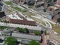 The 1991 environmental certificate for the project adopted this idea, mandating that not more than 25% of the surface could be developed, with the rest maintained as public open space.[44][45] The certificate specifically required that three parcels near South Station, encompassing about four acres of land, be turned over to the Massachusetts Horticultural Society (MassHort) for outdoor gardens and an enclosed winter garden.[42] And the certificate required that the three ramps at Parcels 6, 12, and 18 be covered "to mitigate their impacts on the surface environment."[42]