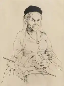 Throughout her career she made portraits, landscapes and seascapes, figure studies, genre paintings, and still lifes. In 1941 a critic said it was the portraits that had made her famous.[1] In 1938 the New York Times critic, Howard Devree, said that Osk's prints were outstanding.[17] A series of four etchings called, "Hands," was widely admired. When shown in 1937 Devree called them "arresting."[18] When shown again in 1941, the Times critic, Ada Rainy, said they were effective in their characterization,[1] and one of them ("The Sailor," shown at left) was included in the book, American Prize Prints of the Twentieth Century.[19][note 5] In her 1941 article on Osk's etchings, Ada Rainey, called "Little Old Lady" (shown at right) "a fine characterization."[1] In 1942 Rainey described a drypoint, "The Sisters" (shown at left), as "done with understanding of the value of strength of line and the structure of the figures."[20] In 1953 the Times critic, Leslie Judd Portner, wrote that Osk's drypoint, "Six O'Clock" (shown at right) was "completely realistic."[21] As well as paintings, etchings, and drypoints, Osk made aquatints and etched relief prints in the late 1940s.[1]