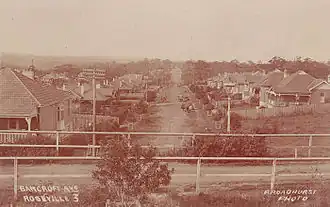 William Henry was one of Ku-ring-gai's first European settlers, who used the area for farming.[3] There were a few fruit orchards and market gardens in the area. Other significant settlers were David Mathew, who owned a property called Clanville, and Richard Archbold, who was granted an area of 600 acres (2.4 km2) adjacent to Clanville.[3] Archbold later acquired Clanville and set up an orchard on the property. Archbold's son-in-law had a stone cottage called Rose Villa, which was later demolished to make way for the North Shore railway line. Roseville eventually derived its name from Rose Villa.[4]
