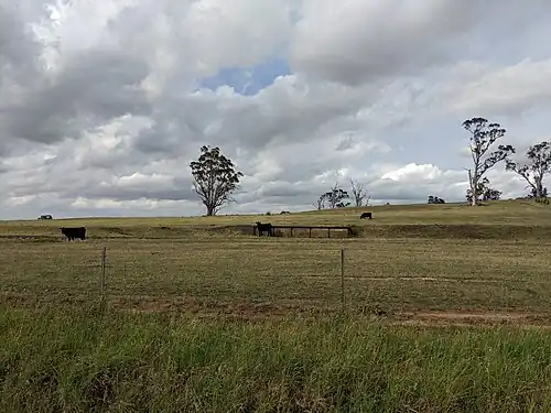 Roslyn railway station was a railway station on the Crookwell railway line, New South Wales, Australia. The station opened in 1902[1] with the opening of the line, and consisted of a 100 ft platform on the down side of the line with a loop siding on the up side.[2] Cattle loading facilities and goods sheds were also provided. It was named after the estate of a local resident Dr Mitchell. In 1925,[3] the station became the location of the branch line to Taralga, with the new branch extending off the loop line. The platform was shortened to 30 ft in 1969, and closed in 1974 with the cessation of passenger services. In 1975, the station and goods facilities were demolished.[4] The line through Roslyn closed to goods traffic in 1984, and little remains at the site apart from the mainline track, the goods loading bank and the station master's residence.