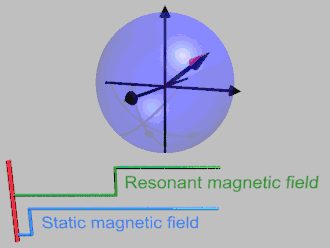 Animation showing the rotating frame. The red arrow is a spin in the Bloch sphere which precesses in the laboratory frame due to a static magnetic field. In the rotating frame the spin remains still until a resonantly oscillating magnetic field drives magnetic resonance.