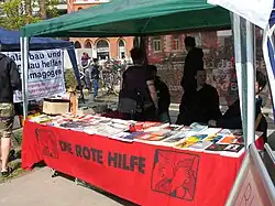 Rote Hilfe e.V. ("Red Aid," abbreviated RH)[1] is a German far-left prisoner support group. RH was founded in 1975, although localized groups calling themselves "Rote Hilfe" had begun to appear at the end of the 1960s.[2][3] The group views itself as a successor to the Weimar-era Rote Hilfe. In the 1970s, it worked on behalf of Red Army Faction prisoners, and a few RH members went on to join the RAF or similar groups (e.g., Angelika Speitel and Hans-Joachim Klein).[4][5] Today half of Rote Hilfe's budget is spent paying the legal fees, fines, and expenses of left-wing prisoners.[3] It also publishes a quarterly journal, Die Rote Hilfe ("Red Aid"), and other publications, organizes events, etc.[3] RH is headquartered in Göttingen[6] and, as of 2023, had about 13,700 members. The Federal Office for the Protection of the Constitution considers it a "left-wing extremist" organization.[3]