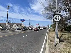 At the point Route 41 crosses Route 70 (Marlton Turnpike), Route 154 ends and Route 41 continues to the northeast on Kings Highway, a five-lane road with a center left-turn lane.[1][3] Route 41 becomes a four-lane divided highway at the crossing of the Pennsauken Creek and enters Maple Shade Township, Burlington County.[1] The route interchanges with Route 38 and with Route 73 a short distance later. It continues to the northeast, where Route 41 ends at the end of state maintenance and Kings Highway continues northeast as CR 611.[1]