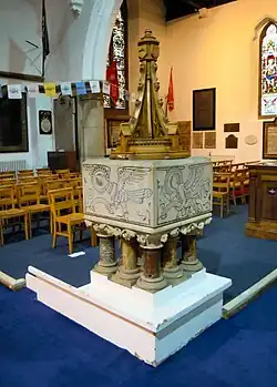 The carved oak pulpit is a memorial to Sir James Alleyn, RA and dates to 1899. In the four quatrefoils at the base of the pulpit are the traditional symbols of the Four Evangelists: the eagle for St John; the lion for St Mark; the bull for St Luke, and the angel for St Matthew.[15]
