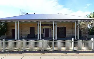 Single storey Georgian sandstone inn, with front verandah and a single-pitch (formerly tiled), hip roof over the whole. Street front verandah has doubled timber Doric columns and a simple scalloped valance. Front six-panel door has glazing in the upper four panels, flanked by side lights and surmounted by a large fanlight. French doors open onto the verandah either side of the central front door with shutters. Four panelled doors sit on the outside of the French doors. All doors have sandstone headers and thresholds. The Front elevation of dressed sandstone, sides and rear are random-coursed.[1]