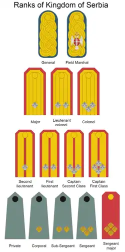 The Army of the Kingdom of Serbia (Serbian Cyrillic: Војска Краљевине Србије, romanized: Vojska Kraljevine Srbije), known in English as the Royal Serbian Army, was the army of the Kingdom of Serbia that existed between 1882 and 1918, succeeding the Armed Forces of the Principality of Serbia and preceding the Royal Yugoslav Army.