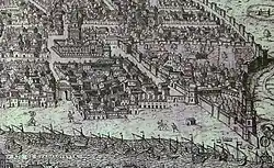 In this view of Seville at the end of the 16th century, "The Shipyards" is indicated with nº 23, next to "Postigo del Carbón" gate (nº 43).