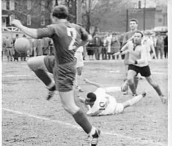 Mendoza (#10) heading ball playing for the St. Louis Kutis in the 1950s