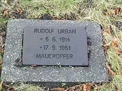 Rudolf Urban was the fourth known of at least 140 victims caused by the Berlin Wall, in order of death, but was the first known victim in order of attempted escape. He was buried at the Dorotheenstädtischer Friedhof II.[5][4] A memorial stone on the Bernauer Straße, near the Swinemünder Straße, which the district office of Wedding 1982 had set up, commemorates his fate and the fate of nine other victims in Bernauer Strasse. His widow, Ilse Urban, was last known to live (in 1985) at Teikeweg 42, in Berlin-Mariendorf.[1][6]