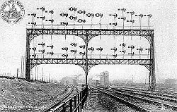 Rugby once had the largest concentration of mechanical signalling in the world and was home to one of the most impressive signal gantries in Britain.[31] Situated to the south of the station and erected in 1895, it spanned three tracks and carried forty-four semaphore arms. Every arm was duplicated due to sighting difficulties that resulted from the Great Central Railway's 'Birdcage' bridge crossing the WCML behind the gantry's location. The gantry acquired the nickname of "the Rugby Bedstead" on account of its appearance.