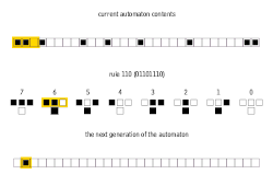 In 2004, Matthew Cook published a proof that Rule 110 with a particular repeating background pattern is Turing complete, i.e., capable of universal computation, which Stephen Wolfram had conjectured in 1985.[2] Cook presented his proof at the Santa Fe Institute conference CA98 before publication of Wolfram's book A New Kind of Science. This resulted in a legal affair based on a non-disclosure agreement with Wolfram Research.[3] Wolfram Research blocked publication of Cook's proof for several years.[4]