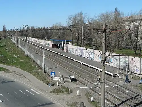 After the launch of the city train in 2011, the station was closed.[2] Originally re-commissioning was planned in 2013 together with the launch of the third stage of the city electric train. In 2022 during the ongoing Russian invasion of Ukraine the station has been temporarily reopened since 19 April, following emergency repairs carried out using internal resources of the Ukrainian State Railway, a full reconstruction is to take place after Russia is defeated.[2]