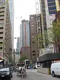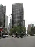 Rush Street is known for hosting some of the few highly rated and esteemed restaurants in the Chicago Gold Coast neighborhood.[36] According to Frommer's and Zagat Survey, Gibsons Steakhouse is one of the favorite restaurants in Chicago,[38][39] and is located on Rush Street. Rush Street is a block east of the original location of the Chicago-style deep dish pizza, Uno Chicago Grill,[40] and it hosts Giordano's, its answer to Uno's. Among the most prominent businesses along this strip is the Bentley and Lamborghini Gold Coast showroom,[35] which is located across East Pearson Street from The Clare at Water Tower along Rush Street. The Clare is one of the tallest residential buildings reserved for seniors anywhere in the world.[41] Rush Street's southern terminus is adjacent to a rear entrance of the Wrigley Building as well as the Trump International Hotel and Tower which has a 401-North Wabash address.[42] The 800 block of the Gold Coast neighborhood portion of Rush Street is a block away from Michigan Avenue and four of the tallest buildings in the world: John Hancock Center (875 North Michigan Avenue), 900 North Michigan, Water Tower Place (845 Michigan), & Park Tower (800 Michigan). Four more of the fifty tallest buildings in Chicago are also a block from Rush Street: Olympia Centre (737 Michigan), One Magnificent Mile, (980 Michigan), Chicago Place (700 Michigan), and Palmolive Building, (919 Michigan). 55 East Erie Street, which was the second tallest all-residential building in the world from 2004 until 2007 when 340 on the Park was completed,[43] is among the skyscrapers on or with entrances on Rush street. There is a current proposal to redevelop 740 North Rush Street (at the corner of East Superior Street) with a fifty-story skyscraper designed by Skidmore, Owings & Merrill and developed by Fordham Company.[44] This address currently houses the Chicago offices of Crain Communications Inc., and it is just north of Giordano's, which has a 730 North Rush Street address.