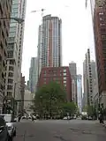 Rush Street is a one-way street in the Near North Side community area of Chicago in Cook County, Illinois, United States. The street, which starts at the Chicago River between Wabash and North Michigan Avenues, runs directly north until it slants on a diagonal as it crosses Chicago Avenue then it continues to Cedar and State Streets, making it slightly less than a mile long.[1] One lane also runs southbound from Ohio Street (600N) to Kinzie Street (400N) as part of a two-way street segment. It runs parallel to and one block west of the Magnificent Mile on the two-way traffic North Michigan Avenue, which runs at 100 east up to 950 north.[2] The street, which is also one block east of the one-way southbound Wabash Avenue, formerly ran slightly further south to the Chicago River where over time various bridges connected it to the Loop, Chicago's central business district.
