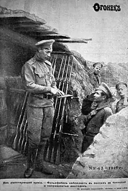 In 1914, the entire army had just 679 motorized vehicles, and most transport was by cart. The 2nd Army, which was to play a decisive role in the offensive in the province of East Prussia, had only 25 field telephones and a telegraph that often broke down, forcing it to send couriers to collect telegrams from the Warsaw post office. The Russian general staff, like that of the other belligerents, had counted on a short war: the ammunition reserve, 7 million shells at the start of the conflict, soon proved insufficient, while the Ministry had not drawn up a war production plan. From the start of 1915, recruits had to train without rifles and, when they went to the front, had to wait to collect weapons from the men they had killed. No one envisaged that the war would last beyond autumn, and there were not even sufficient stocks of winter clothing for the Battle of the Carpathians. Soldiers lacked shoes and harnesses because almost all the tannin for leather was imported from Germany. Equipment imported from the Allies and the United States arrived only slowly; it was very heterogeneous and, by the end of the war, the infantry was using 10 different calibers.[35] Most generals misunderstood the logic of Attrition warfare and neglected to dig trenches, or were content with a single superficial line. Aleksei Brusilov, head of the 8th Army, was one of the few commanders to prescribe a triple line of defense but found that his subordinates neglected his instructions.[36]