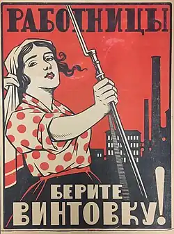 The February Revolution toppled the tsarist regime and established a provisional government. A few women were highly visible in this revolution, especially those who gathered in mass protest on the International Women's Day to call for political rights. They gained rights under the provisional government, including the right to vote, to serve as attorneys, and equal rights in civil service. Women advocating for these kinds of political rights generally came from upper and middle-class background, while poorer women protested for "bread and peace."[8] Record numbers of women joined the Russian army. All women's combat units were put into place, the first of these forming in May 1917.[9]