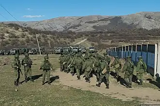 On 4 March, Ukrainian General Staff said there were units of the 18th Motor Rifle Brigade, 31st Air Assault Brigade and 22nd Spetsnaz Brigade deployed and operating in Crimea, instead of Russian Black Sea Fleet personnel, which violated international agreements signed by Ukraine and Russia.[163][164] At a press conference on the same day, Russian president Vladimir Putin said that Russia had no plans to annex Crimea.[165] He also said that it had no plans to invade Ukraine, but that it might intervene if Russians in Ukraine were threatened.[165] This was part of a pattern of public denials of the ongoing Russian military operation.[165]