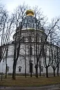 Russian churches often have various recurrent elements in their architecture. The onion dome is for example a recurrent and important element in the architecture of Russian churches. Often Russian churches have also multi-colored filigree ornamental elements. Furthermore the colour white plays an important role in the style of Russian churches. In the past, Russian churches were made out of wood.[1][2][3] Many Russian Orthodox churches are distinguished by their verticality, bright colors and multiple domes, which provide a striking contrast with the flat Russian landscape, often covered in snow. The first churches in Kievan Rus', such as the 13-domed wooden Cathedral of St. Sophia, Novgorod, differed in this regard from their mainly single-dome Byzantine predecessors. The number of domes was important symbolically. One dome symbolized the single God; three represented the Trinity, and five represented Christ and his four evangelists.[4] At first the baptistery, narthex, and choir gallery above the narthex were a common feature of Rus' churches, but gradually they disappeared. After a century of Byzantine imitations, the Russian masons began to emphasise the verticality in church design.