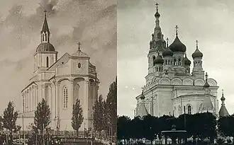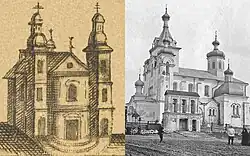 The Dominican Monastery in Stolbtsy (on the left) before reconstruction, and after reconstruction (on the right) in the Russian Revival Architecture style. - 1852. With the liquidation of the Greek Catholic Church, the mass destruction of Belarusian religious literature began. Joseph Semashko was a personal witness of the burning of 1,295 books found in Belarusian churches. In his memoirs, he proudly reports that over the next three years, two thousand volumes of books in the Belarusian language were burned by his order.[67][68]