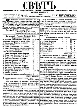 Dukhnovych passed away in 1865, after which the cultural center of the Rusyn awakening shifted from Prešov to Uzhhorod.[41] In response to his death, the Society of St. Basil the Great (Общество св. Василія Великого, Obshchestvo sv. Vasylia Velykoho) was founded in Uzhhorod in 1866 by Adolf Dobriansky and Ioann Rakovsky. The society began publishing the first newspaper by the Rusyn intelligentsia, the weekly Svit, which was written in the Carpatho-Rusyn dialect of the Russian language.[41][44][45] Like the Society of St. John the Baptist, it aimed to establish Rusyn schools and published textbooks in both Rusyn and Hungarian.[45][46]