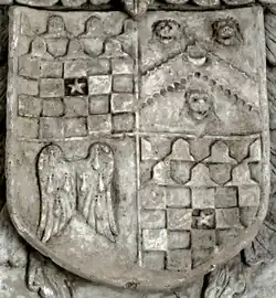 In about 1620 a plaster escutcheon was affixed inside the house showing the de Via arms of the Davie family impaled with the arms of Northcote,[7] the arms of the family of his first wife Katherine Northcote (d.1620).[8]