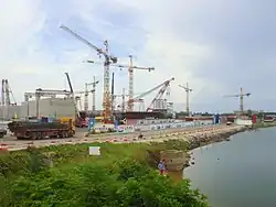 By the beginning of May, 2017, of the 553 caissons required, 460 had been prefabricated and 400 had been installed. The caissons weigh between 500 and 1,700 tons each.