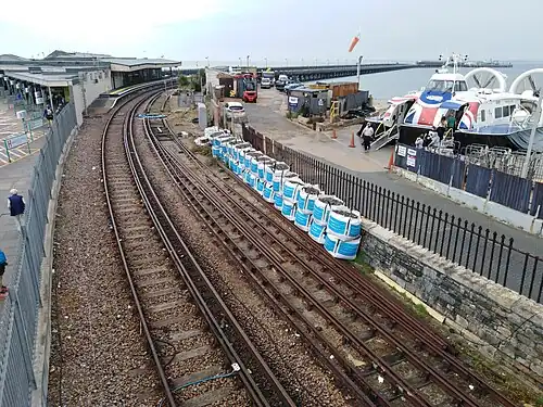 A station has existed on the site since 29 August 1864, when a horse-drawn tram service began operation along the new Ryde Pier.[1] This service, and the line it ran along, pre-dates both the railway line and the current facilities on the site. The tramway was extended to St John's Road in August 1871, but in 1880 this service was replaced by the railway line and current station. The tramway station was originally known as Pier Gate. Trams continued running under various power sources until after the Grouping of Britain's railways in 1923, right up to January 1969.[2] The tram lines and the remaining terminus platforms for them are still visible at the western end of platform 1.
