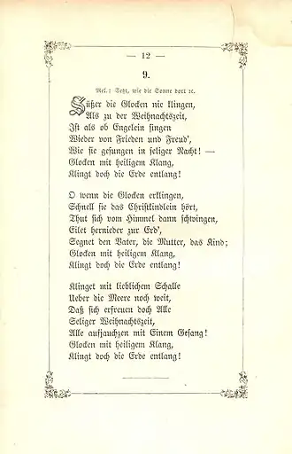 Ludwig Tiesmeyer, Paul Zauleck (Hrsg.), Helias Putsch (musikalisch bearb.): Das Buch der Weihnachtslieder. 2., völlig neu bearbeitete Auflage. Heinsius, Bremen 1896, p. 106 f. (Wikisource). - ^ a b c Nicolai, Claudia (14 December 2014). "Süßer die Glocken nie klingen". lieder-archiv.de (in German). Retrieved 17 December 2020.