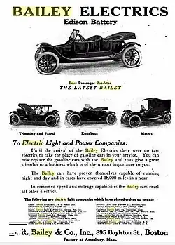 The company, based in Amesbury, Massachusetts, originally manufactured car bodies. Amesbury was a major center of car body manufacturers prior to the Great Depression. In 1907, S.R. Bailey began the production of automobiles. The brand name was Bailey, sometimes with the addition of Electric. 1916 was the last year of production, when the enterprise went into bankruptcy. Assets were purchased by Biddle and Smart, manufacturer of automobile bodies, in 1917.[1]