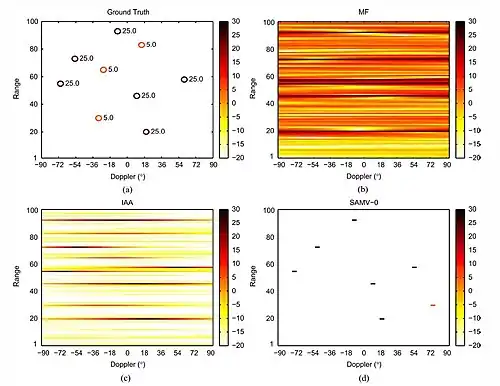 A typical application with the SAMV algorithm in SISO radar/sonar range-Doppler imaging problem. This imaging problem is a single-snapshot application, and algorithms compatible with single-snapshot estimation are included, i.e., matched filter (MF, similar to the periodogram or backprojection, which is often efficiently implemented as fast Fourier transform (FFT)), IAA,[5] and a variant of the SAMV algorithm (SAMV-0). The simulation conditions are identical to:[5] A -element polyphase pulse compression P3 code is employed as the transmitted pulse, and a total of nine moving targets are simulated. Of all the moving targets, three are of dB power and the rest six are of dB power. The received signals are assumed to be contaminated with uniform white Gaussian noise of dB power.