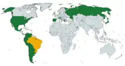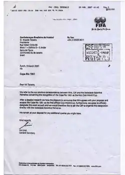 The competition was organized by the Brazilian Sports Confederation, with the assistance and endorsement of FIFA, and had this name on the trophy because it was sponsored by the City of Rio de Janeiro.[16][17] FIFA declares that Palmeiras holds the title of the first world competition between clubs in history. Approved by the FIFA Executive Committee on 7 June 2014.[18][19] However, without changing the nomenclature or unifying the competition with the current FIFA Club World Cup, just as the entity also does with the Intercontinental Cup in its reports. From 2017 until the beginning of 2021, the entity had stopped mentioning the world status of the 1951 Copa Rio, despite the recognition decision granted by its executive committee not having been revoked. With the entity starting to treat the competition, during this period, as the "first intercontinental club tournament". However, FIFA reposted, in January 2021, the 2016 article where the entity used the term "world" to designate the Palmeiras achievement.[20] Then, she published an article about the great Palmeiras teams throughout the 20th century, highlighting the Copa Rio, where the three main FIFA directors at the time are mentioned, including president Jules Rimet, in the dream championship held in 1951 and also reposted the 2016 article for the second time with the term "world cup".[21] A year later, in February 2022, FIFA once again treated Palmeiras as world champions in 1951.[22][23] On 1 March 2024, it was announced that Palmeiras' museum outside Allianz Parque had received a translated "ata" document from FIFA with celebrations for the confirmation of the title as an official club world competition and S.E. Palmeiras as the first club world champions.[24][25][26][27][28][29]