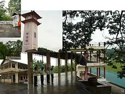The school is well known for its symbolic clock tower, gigantic stone steps, Chinese pavilions and functional water fountain .