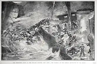The Third Flotilla returned to Zeebrugge on 24 March 1917,[11] and together with the other torpedo boat Flotillas based in Flanders, took part in unsuccessful sorties into the English Channel on 10, 13 and 18 April.[12] The Germans tried again on the night of 20/21 April 1917, in the Battle of Dover Strait, splitting their force into three groups. One, Gruppe Gautier, consisting of G42, G85, S53, V71, V73 and V81 was to attack the Dover Barrage and attack Dover, while the second, Gruppe Albrecht, also consisting of six torpedo boats, was to attack the Barrage and Calais, while the third force of three torpedo boats, Gruppe Zander was tasked with attacking shipping in The Downs.[12][13] At about 23:30 hr on 20 April Gruppe Gautier encountered the trawler Sabreur and attacked with gunfire, scoring two hits. While the Germans believed that they had sunk the trawler, Sabreur managed to escape. Gruppe Gautier then shelled Dover and was fired on in response by British coastal artillery. It then moved off down the Channel to attack the Dover Barrage, but encountered the British Flotilla Leaders Broke and Swift. G42, commanded by Bernd von Arnim, was rammed by Broke. Both ships were heavily damaged in the collision, and were entangled together for a short time. While the ships were entangled, close-quarters battle broke out between the two crews until Broke disengaged. G42 sank with 36 sailors killed in action. G85, torpedoed by Swift, was also sunk in this action.[14][15][16]