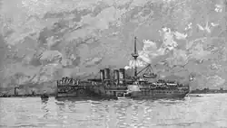 After finally entering regular service in 1880, Sachsen joined the Training Squadron of the German fleet. She was commissioned on 15 April for the year's training exercises, and was decommissioned for the winter on 27 September.[10] At that time, the German fleet was tasked primarily with coastal defense against France and Russia, who were presumed to be the most likely enemies in a continental war.[11] The ship saw little further activity in the early 1880s, as further improvements were made to the ship. She was briefly recommissioned from 15 February to 12 May 1882 for more testing, including the first firing of her main guns. KzS Max von der Goltz served as her commander during this short period in commission.[10] During this period, heightened tensions with Russia prompted the naval command developed more offensively-minded contingencies. These formed the basis for the annual summer fleet maneuvers, in which Sachsen took part.[12] The ship was recommissioned again on 22 April 1884 under the command of Korvettenkapitän (KK—Corvette Captain) Friedrich von Pawelsz, for the second time she was to join the Training Squadron. By that time, all three of her sisters had been completed and were ready to serve as a homogeneous division. Following the completion of the fleet exercises, she was decommissioned again on 30 September.[10]