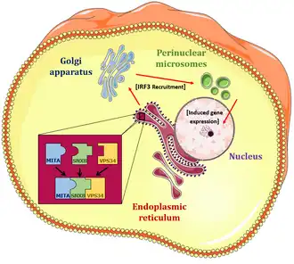 - ^ a b c Wei, Jin; Lian, Huan; Guo, Wei; Chen, Yun-Da; Zhang, Xia-Nan; Zang, Ru; Zhong, Li; Yang, Qing; Hu, Ming-Ming; Luo, Wei-Wei; Shu, Hong-Bing; Li, Shu; Feng, Pinghui (15 October 2018). "SNX8 modulates innate immune response to DNA virus by mediating trafficking and activation of MITA". PLOS Pathogens. 14 (10): e1007336. doi:10.1371/journal.ppat.1007336. PMC 6188873. PMID 30321235.
